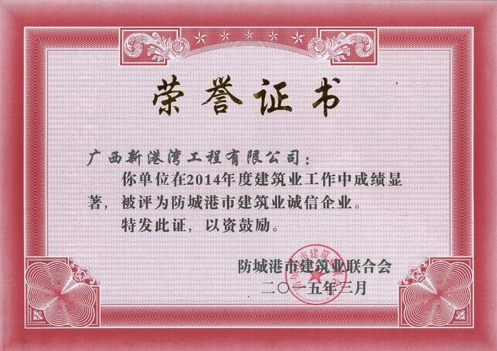 3月防城港市建筑業(yè)聯(lián)合會(huì)召開建筑企業(yè)誠信評(píng)定。會(huì)上公布了防城港市建筑企業(yè)誠信企業(yè)并頒發(fā)榮譽(yù)證書,廣西新港灣工程有限公司榮獲2014年度防城港市建筑企業(yè)誠信企業(yè)。