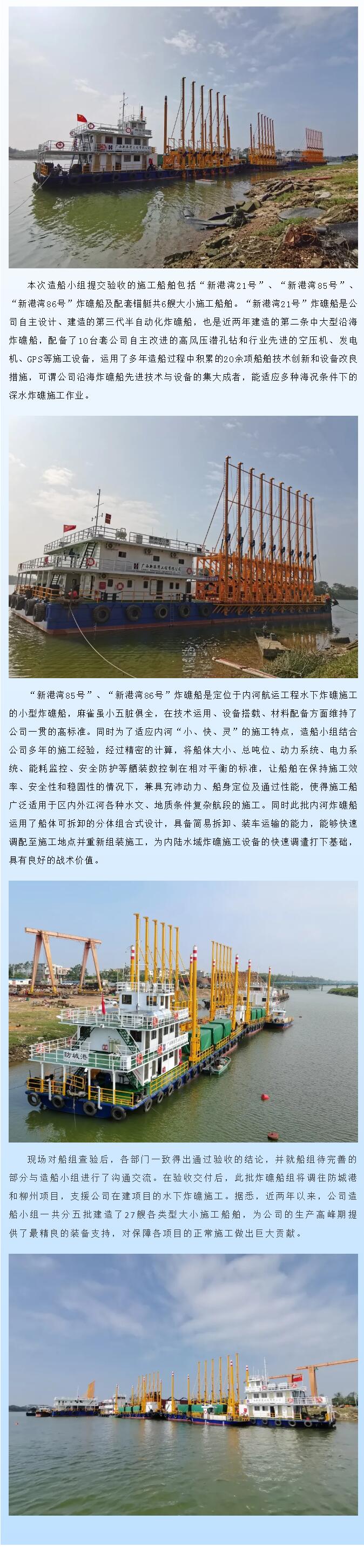 2021年11月3日,公司設(shè)備部、安全部、供應(yīng)部、財(cái)務(wù)部和總工室一同前往北海造船廠對(duì)第五批炸礁船進(jìn)行交付前的驗(yàn)收。